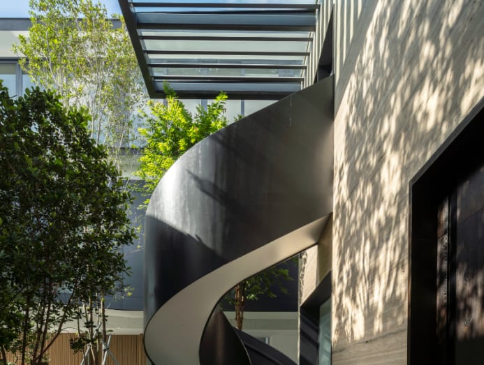 "The screw staircase is a sculptural feature forming role of the garden scene," shared Kee. At night, the staircase's underside is a glowing ribbon of white. Lit with LED strips, its curves are amplified in the darkness.